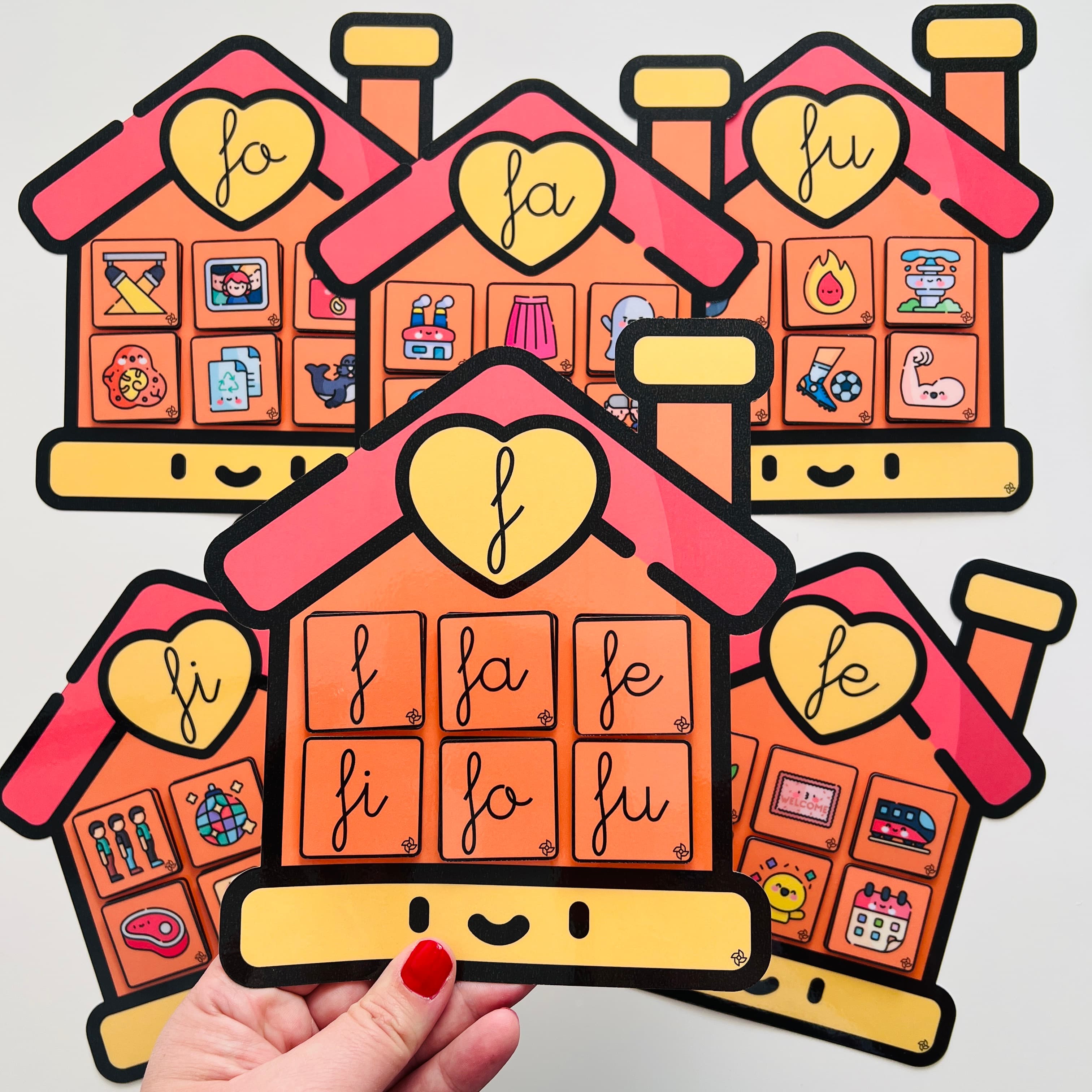- 5 casitas con las sílabas fa, fe, fi, fo, fu.