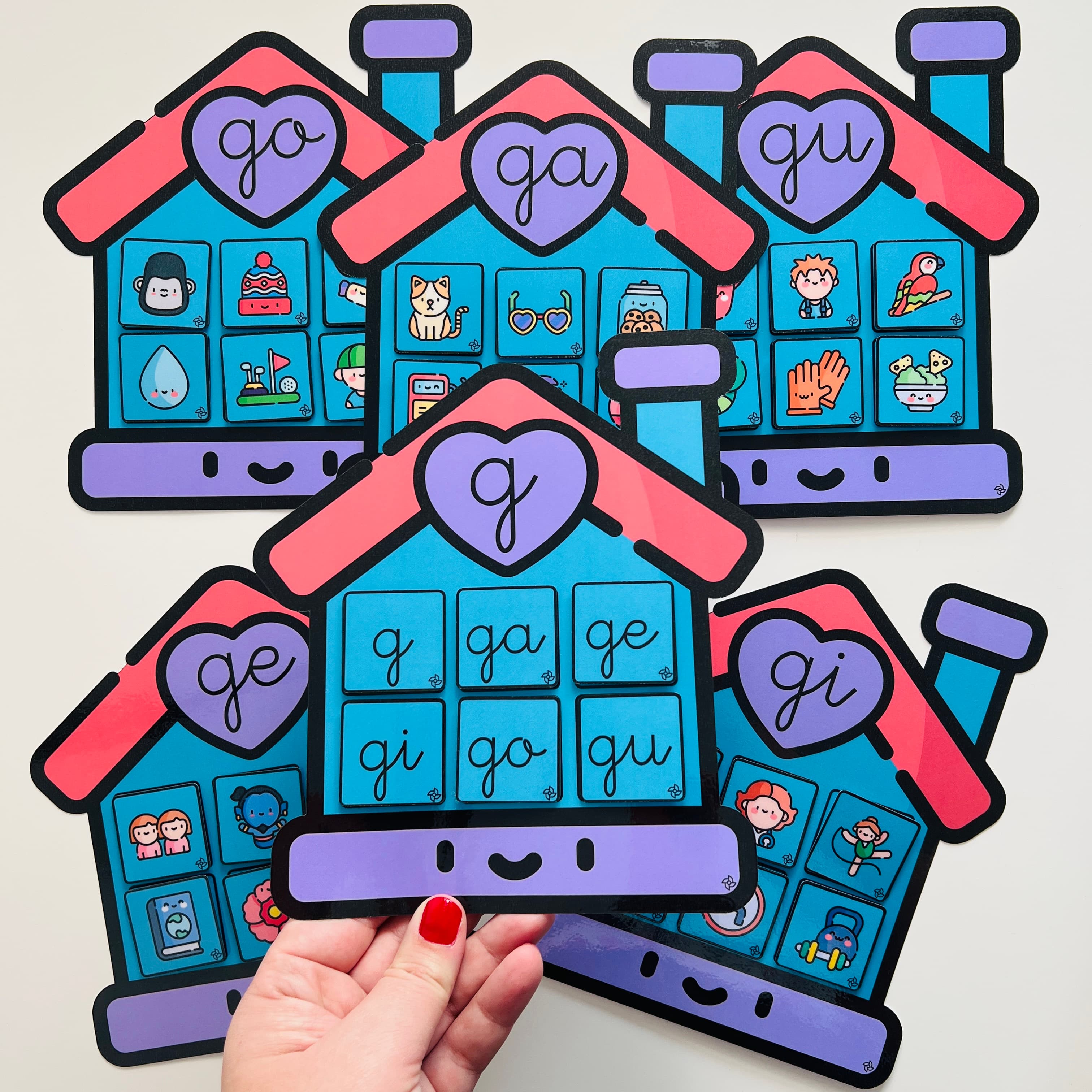 • 5 casitas con las sílabas ga, ge, gi, go, gu.