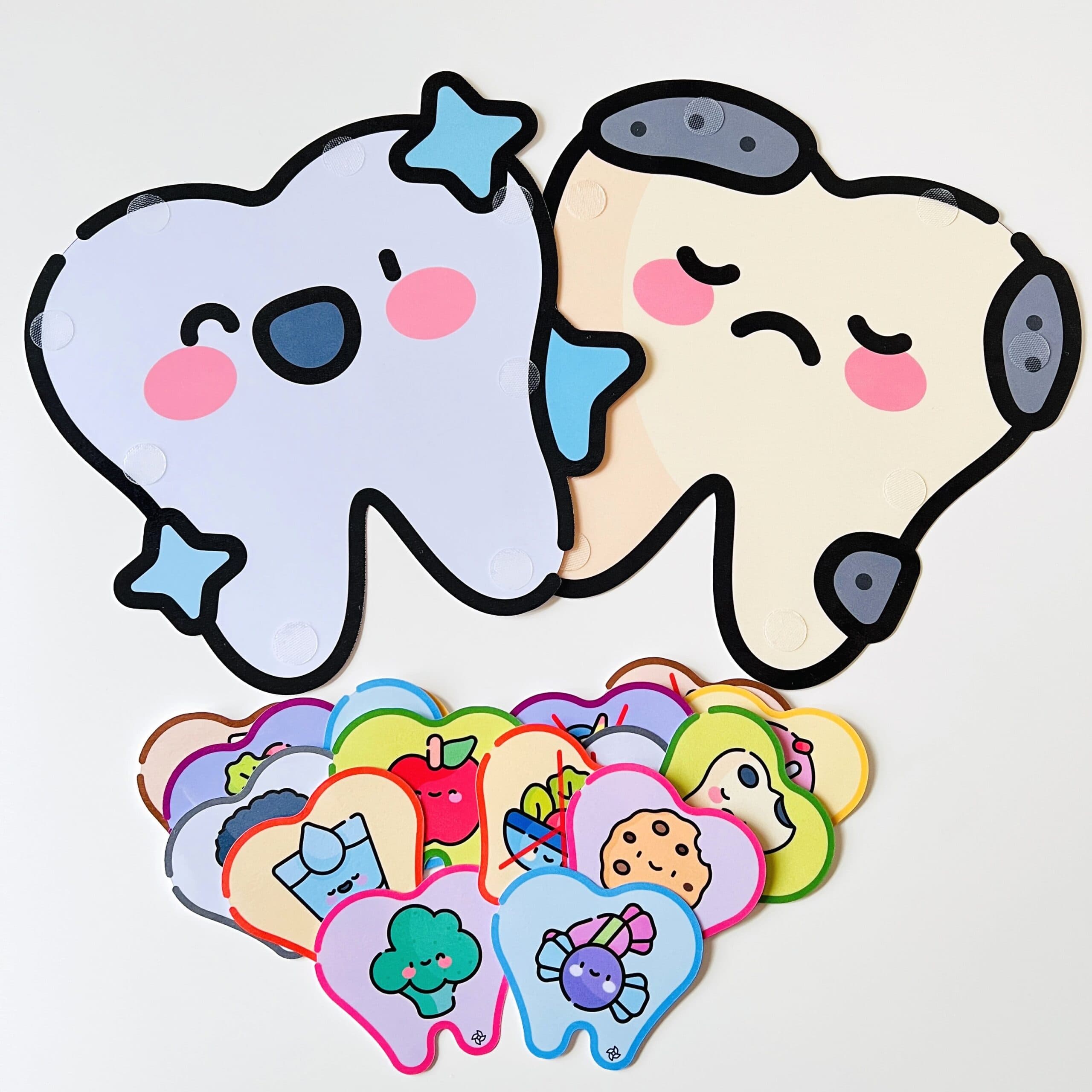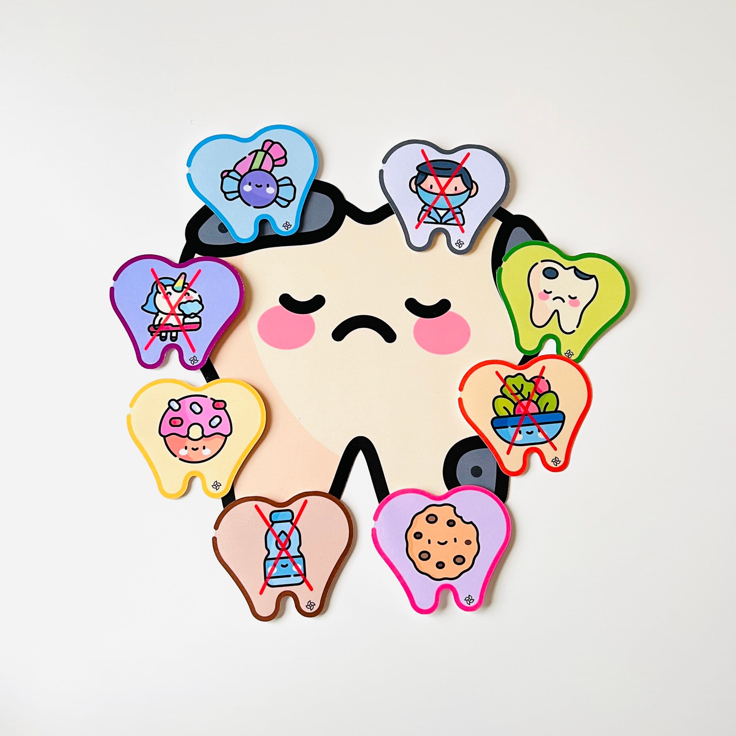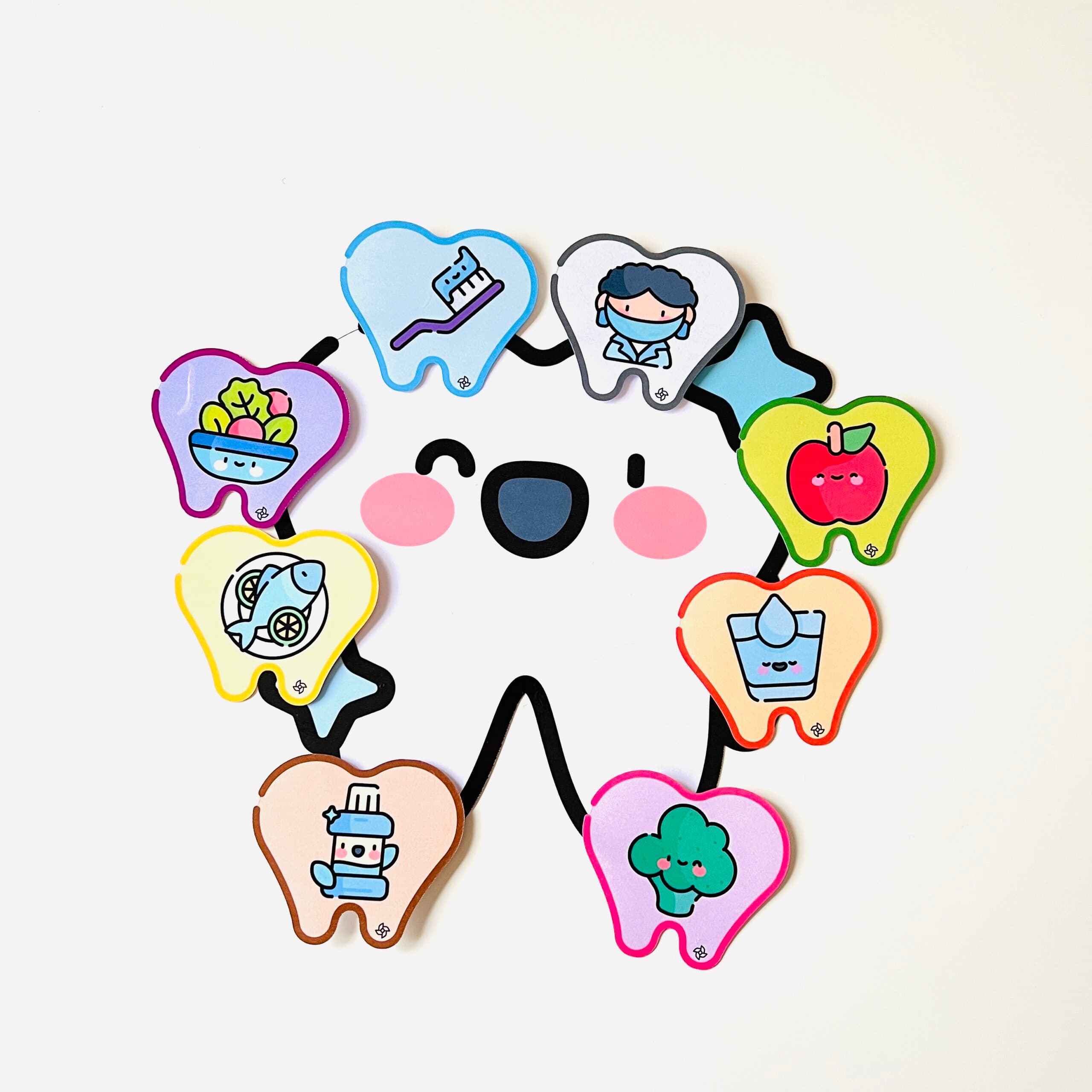 - 4 láminas con los dientes triste y feliz y sus diferentes elementos.