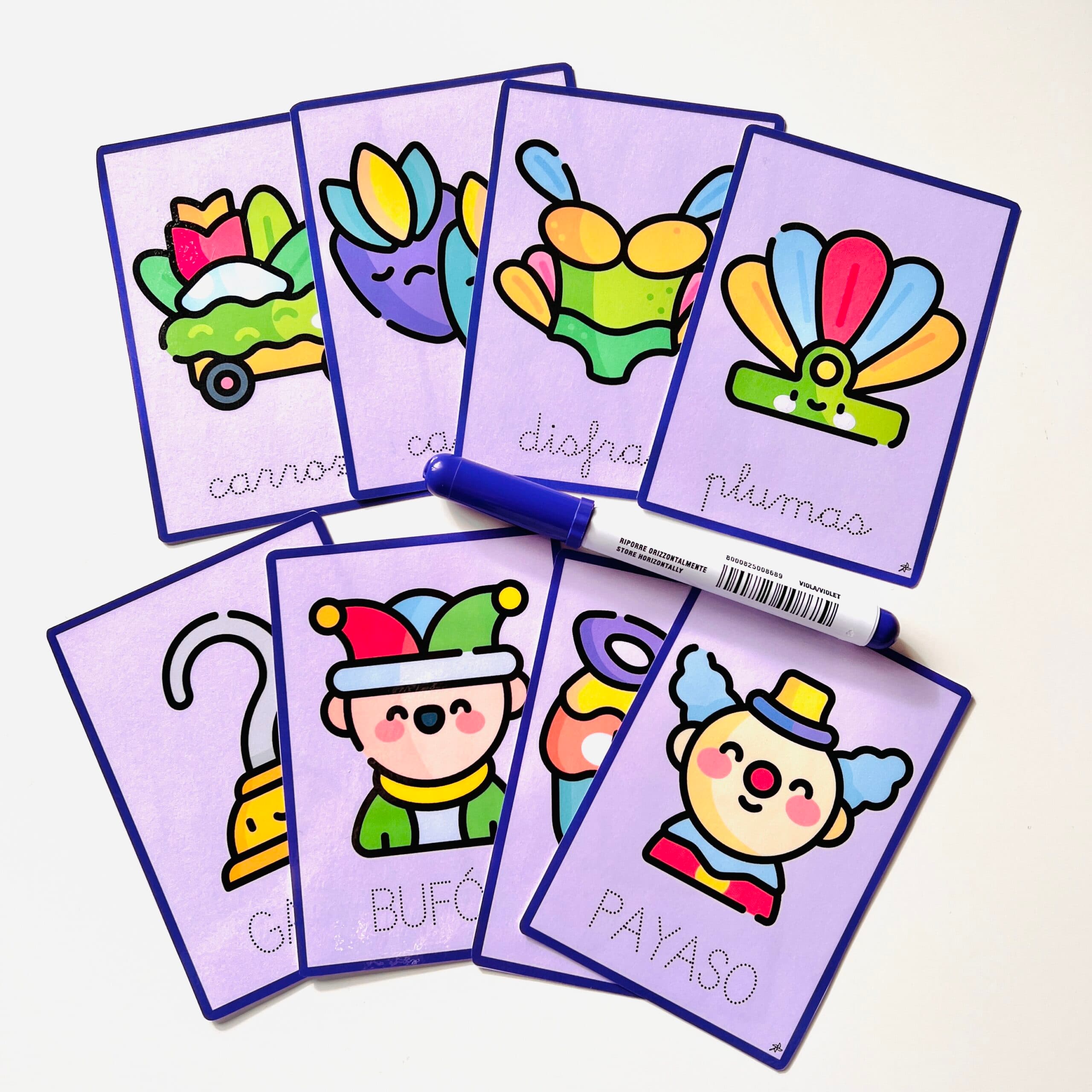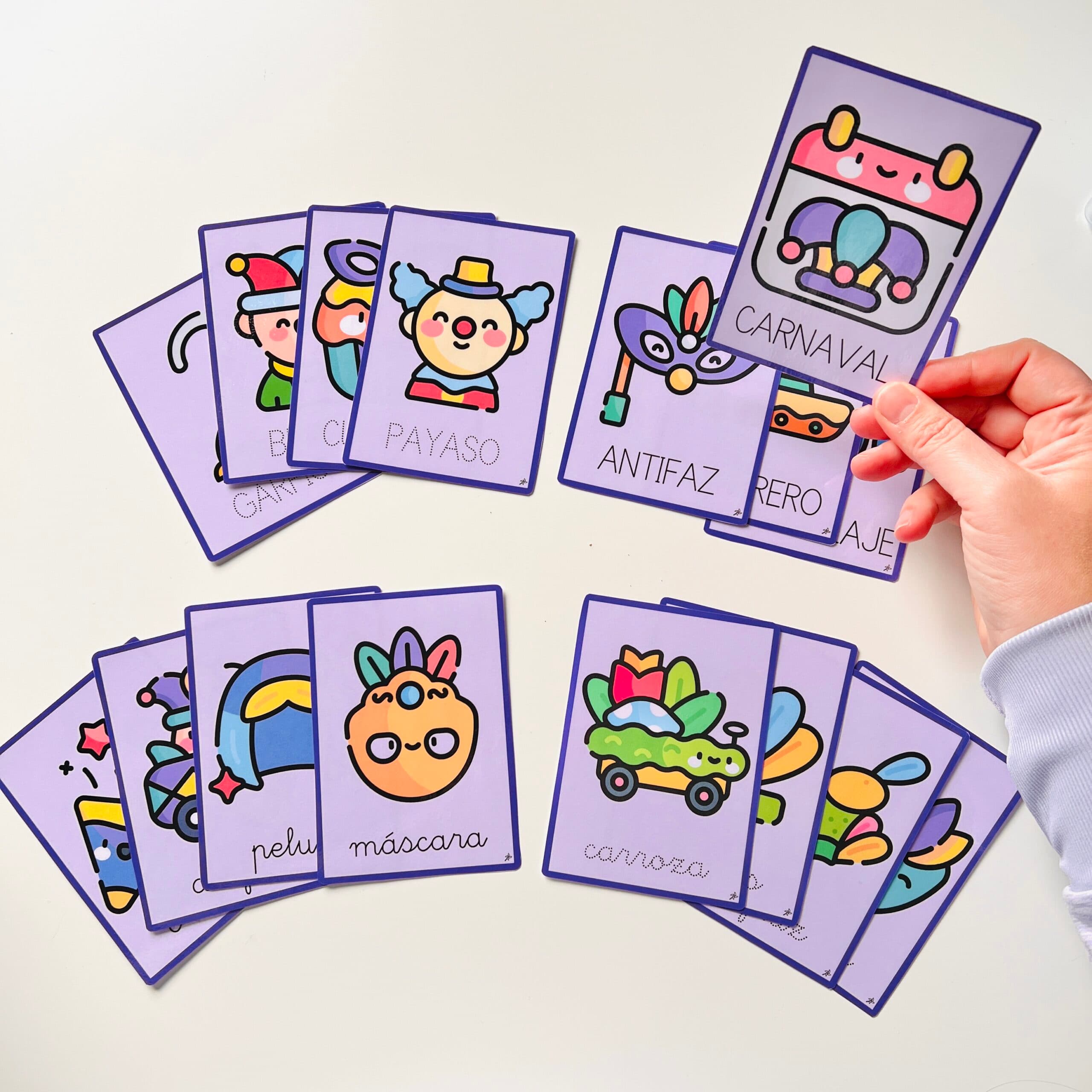 Juego con 24 tarjetas de aprendizaje para trabajar vocabulario relacionado con la temática del carnaval.