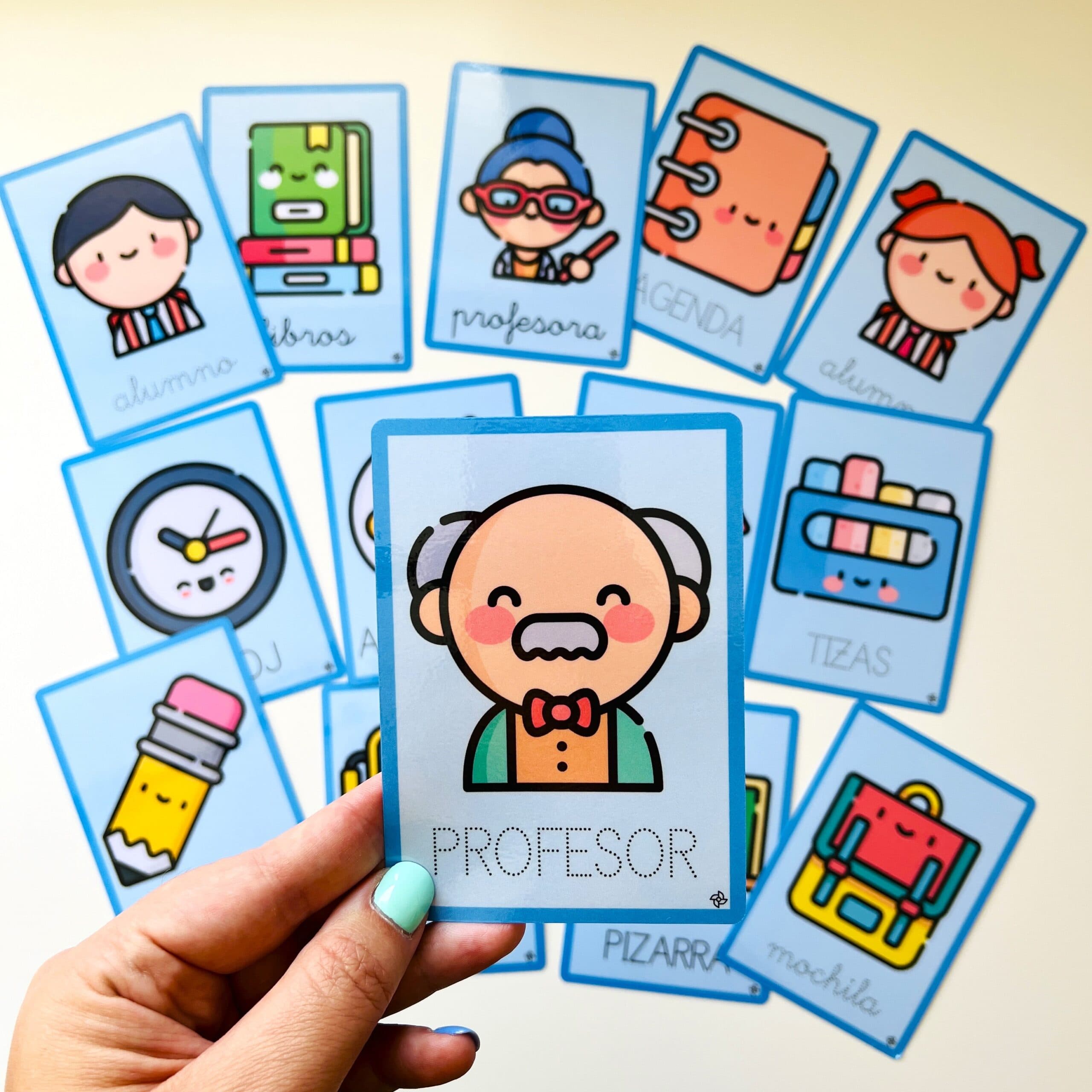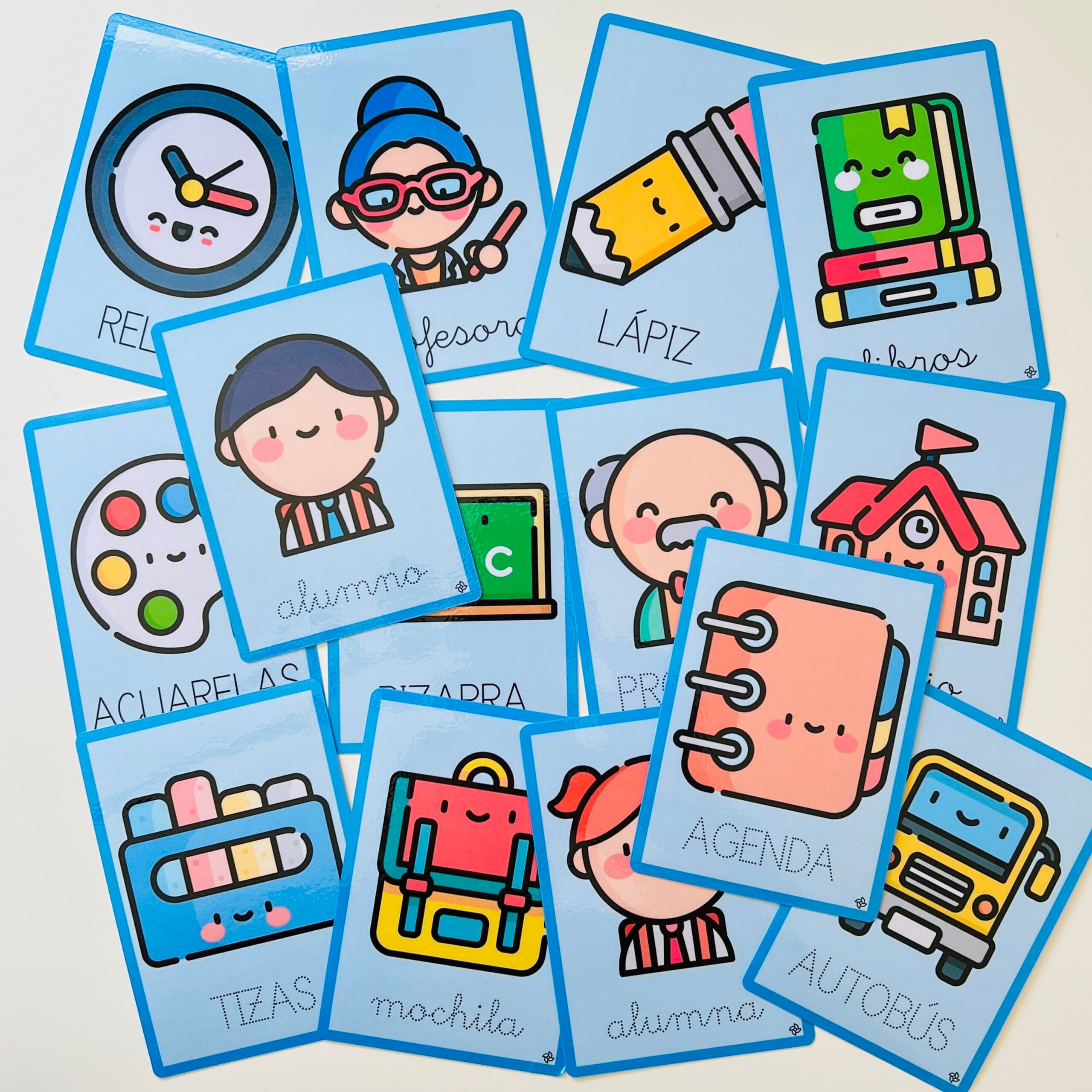 Juego con tarjetas de aprendizaje para trabajar y ampliar el vocabulario relacionado con la temática del colegio. Además, contribuyen a la iniciación en el proceso lectoescritor de forma divertida y motivadora. Ideal para la vuelta al cole.