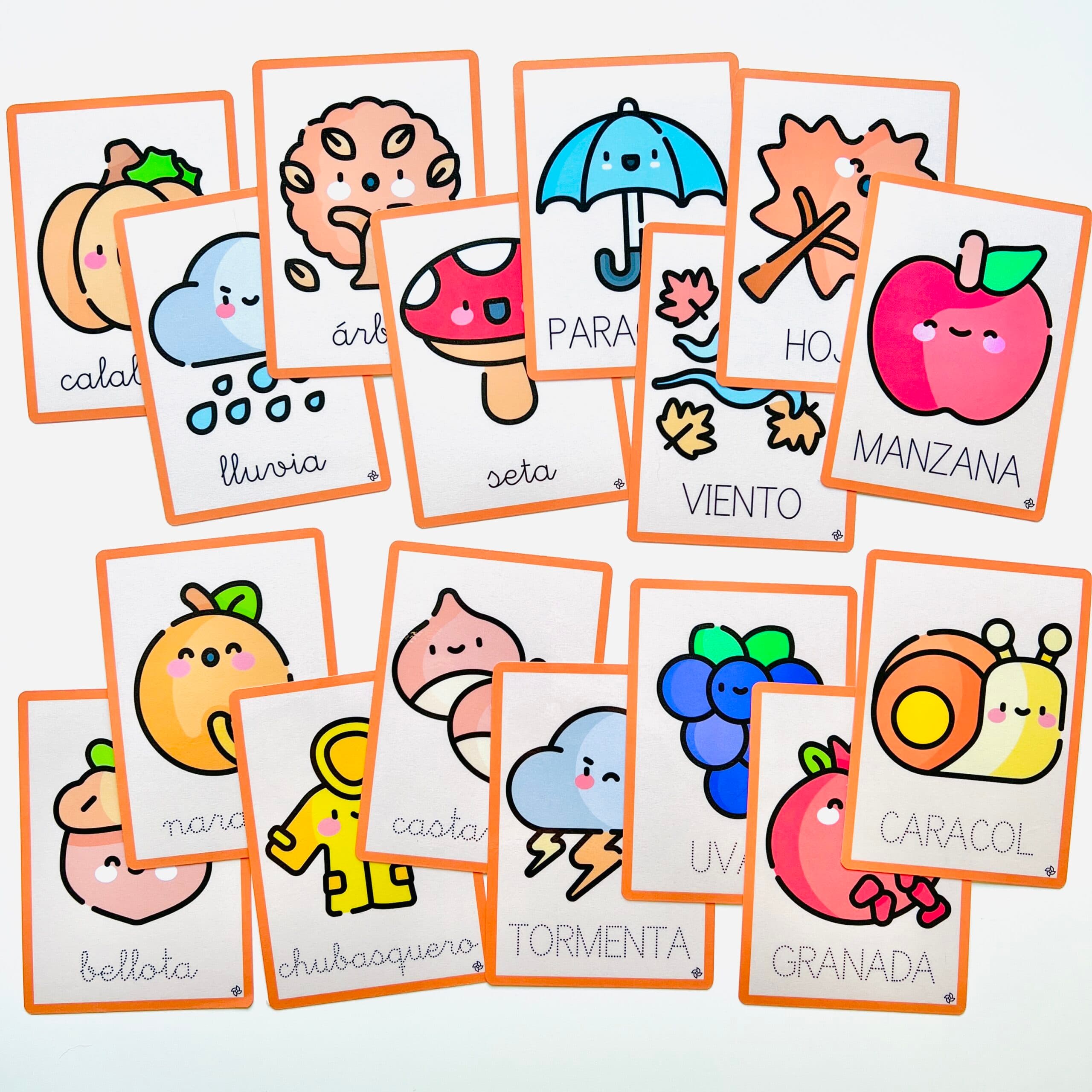 Este recurso nos va a permitir utilizar las flashcards de forma educativa y didáctica en actividades de aprendizaje de vocabulario relacionado con el otoño, así como en actividades de ampliación y/o refuerzo. Puedes elegir las flashcards que mejor se adapten al trabajo que quieras realizar con tus peques, las puedes encontrar en letra mayúscula, minúscula y punteadas para repasar tanto en mayúscula como en minúscula.