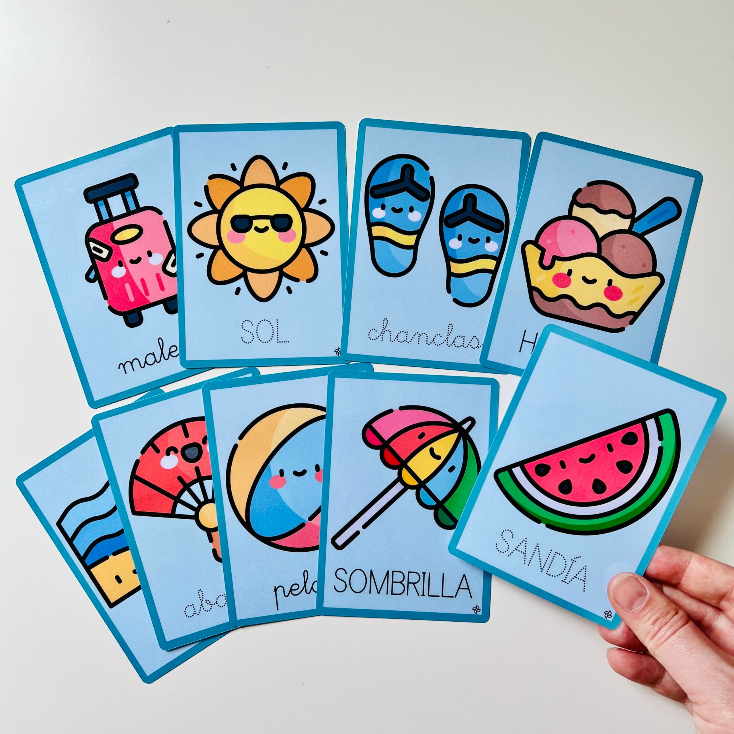 Juego con tarjetas de aprendizaje para trabajar y ampliar el vocabulario relacionado con la temática del verano. Además, contribuyen a la iniciación en el proceso lectoescritor de forma divertida y motivadora.