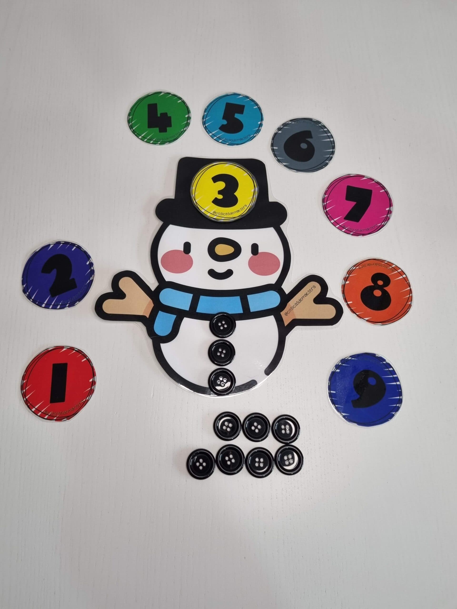 En invierno a los peques les encantan los muñecos de nieve así que vamos a aprovechar su interés por ellos para desarrollar conceptos lógico matemáticos y psicomotores. Mediante este juego los niños aprenderán de forma natural a asociar un número del 0 al 9 a su cantidad a la vez que fortalecen su motricidad fina.