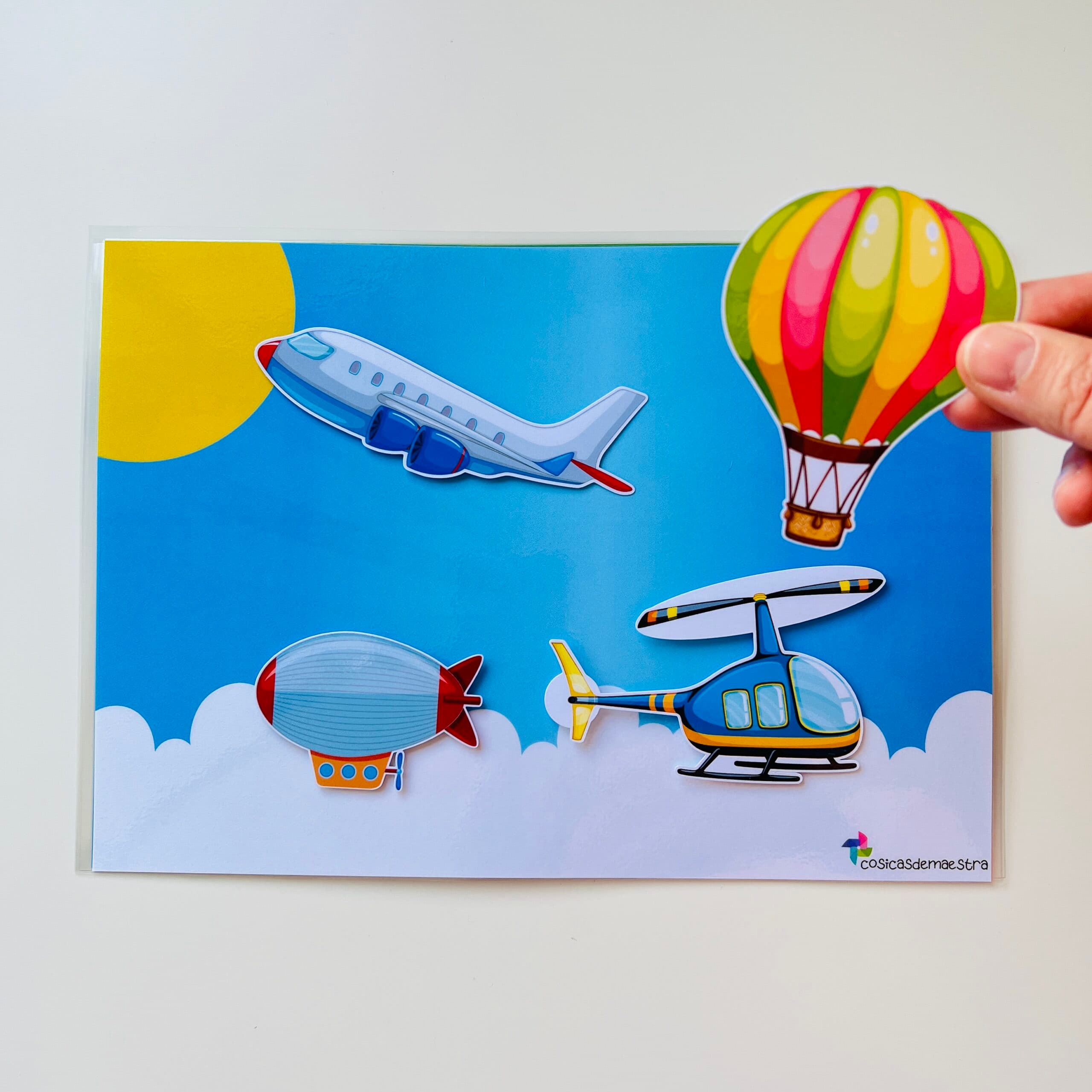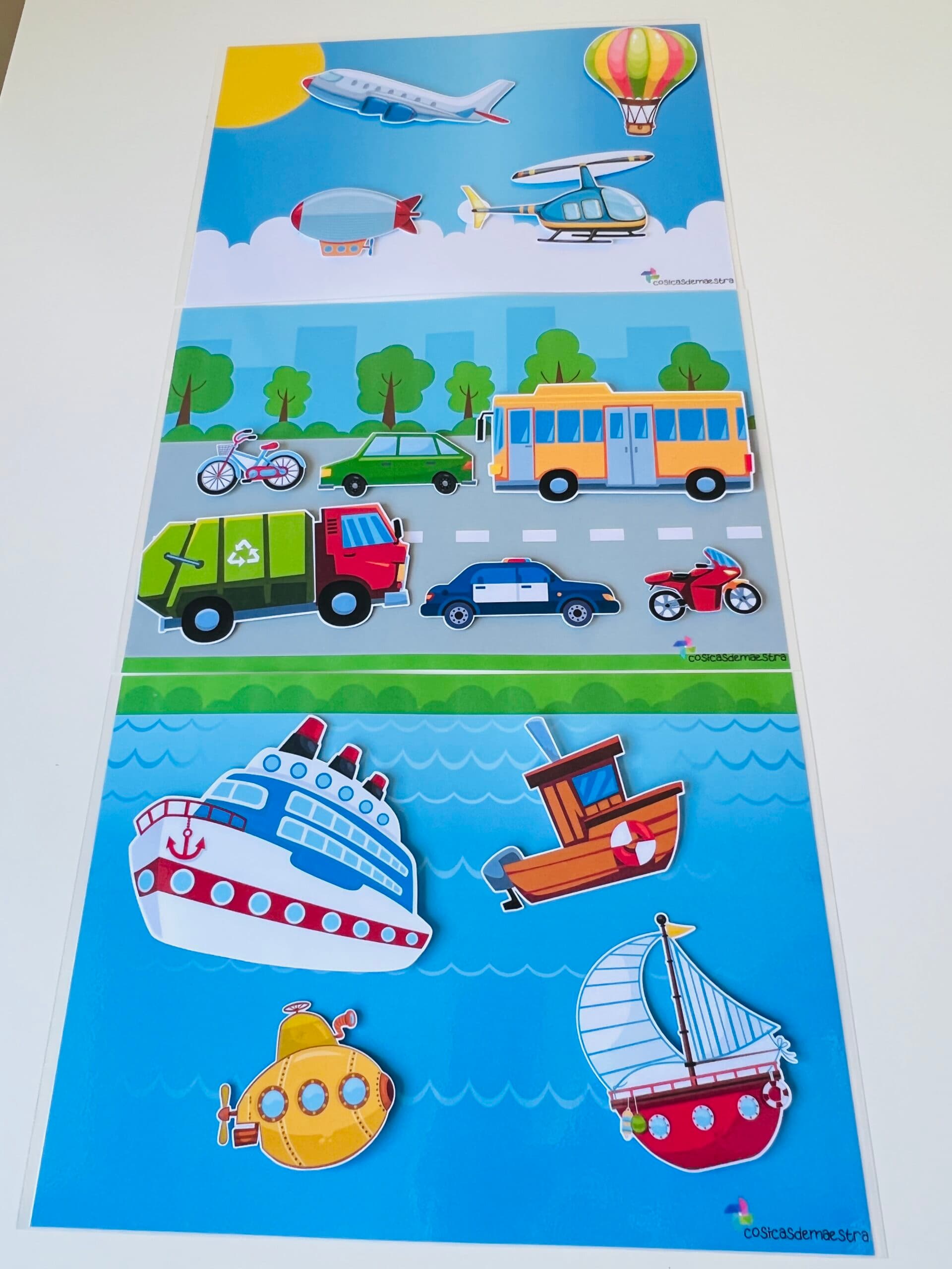 Con este juego vamos a trabajar la clasificación y asociación de diferentes medios de transporte con el entorno por el que se desplazan, además de ampliar vocabulario relacionado con esta temática. También podemos trabajar descripciones de transportes y sus medios, colores, elementos, escribir los diferentes nombres de los transportes, etc.