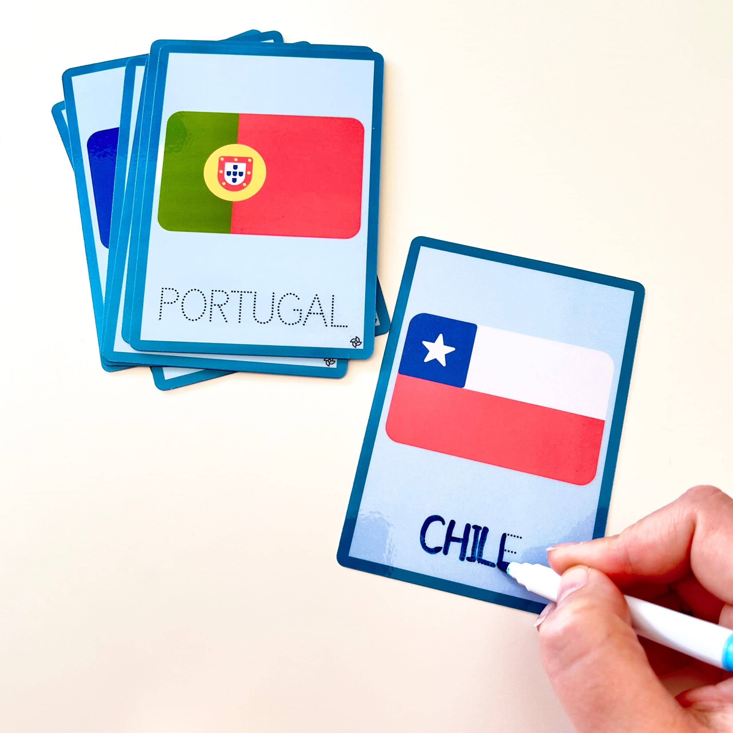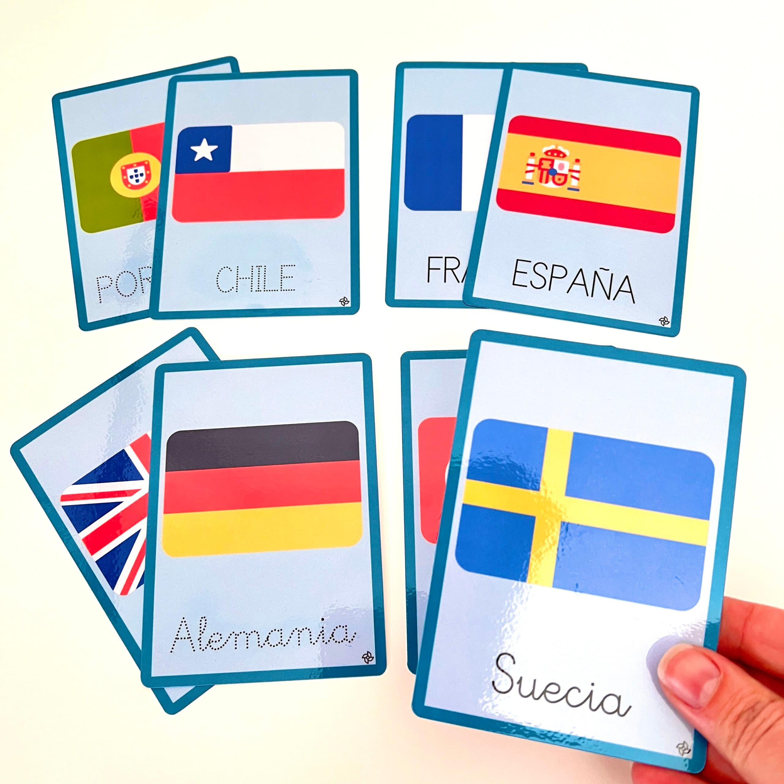 Juego con tarjetas de aprendizaje para trabajar vocabulario relacionado con la temática de las banderas.