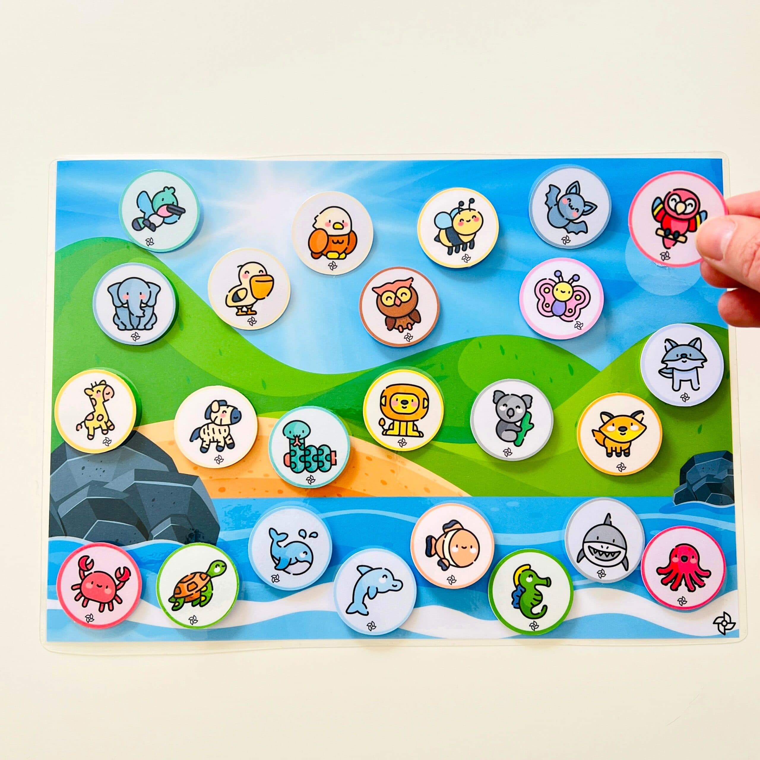 - Lámina de juego para colocar cada animal en su lugar correspondiente.